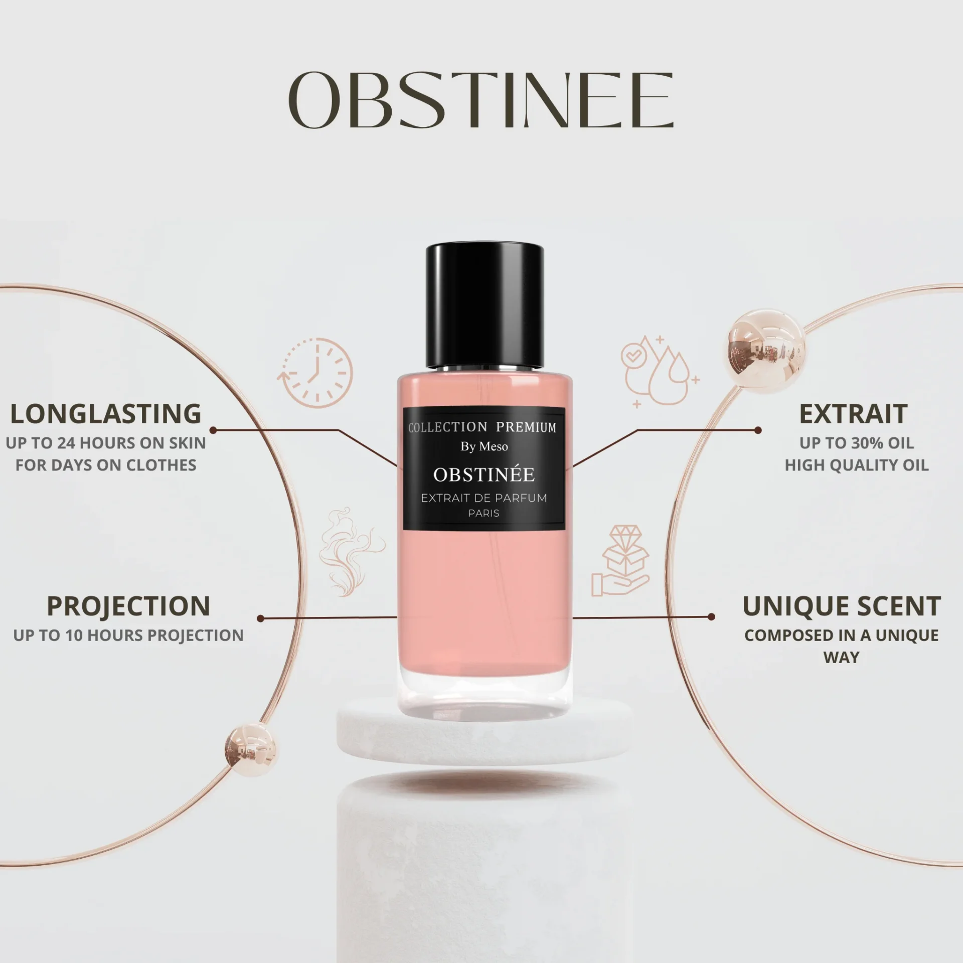 Obstinée is een geur die opent met sappige peer, pittige roze peper en zoete oranjebloesem, waardoor een uitnodigende en levendige fruitige start wordt geïntroduceerd. Deze boeiende aanvang prikkelt onmiddellijk de zintuigen en nodigt uit tot verdere verkenning van de geur.