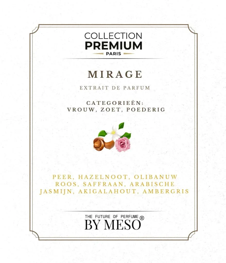 Mirage opent met frisse, sappige peer, nootachtige hazelnoot en de warme, rokerige tonen van olibanum (kerkwierook). In het hart ontvouwen zich de bloemige en exotische geuren van osmanthus, roos, saffraan en Arabische jasmijn (Sambac), die een rijke, verfijnde toets geven. De basis wordt gevormd door de diepe, aardse warmte van sandelhout, zoete vanille, kruidig Akigalahout, dierlijke ambergris en harsachtige labdanum, wat zorgt voor een langdurige en complexe geurervaring.