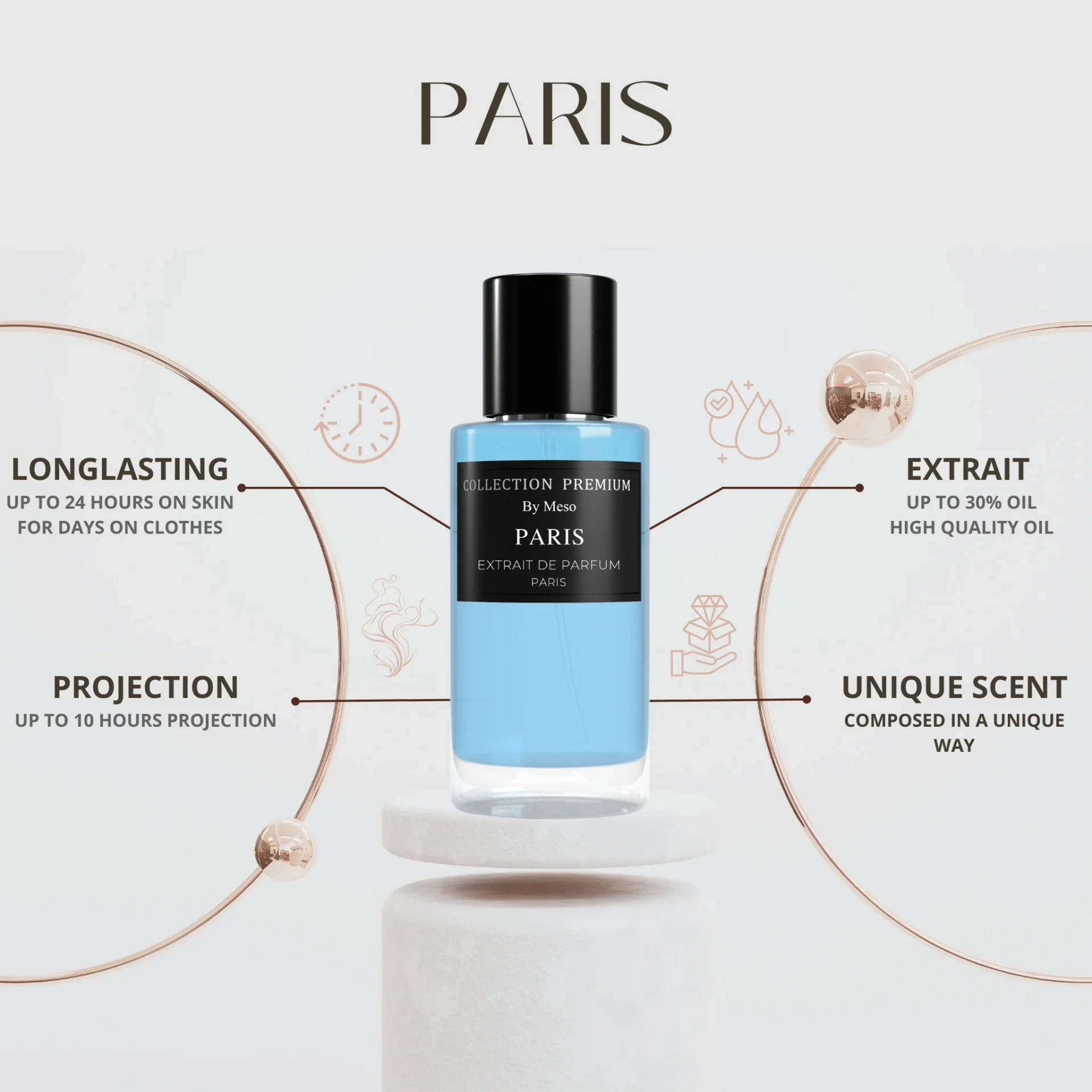 Ten slotte voegt een vleugje amber een element van warmte en verleidelijkheid toe aan de geur. De subtiele ambernoten zorgen voor een blijvende indruk en maken Paris tot een geur die krachtig en betoverend is.