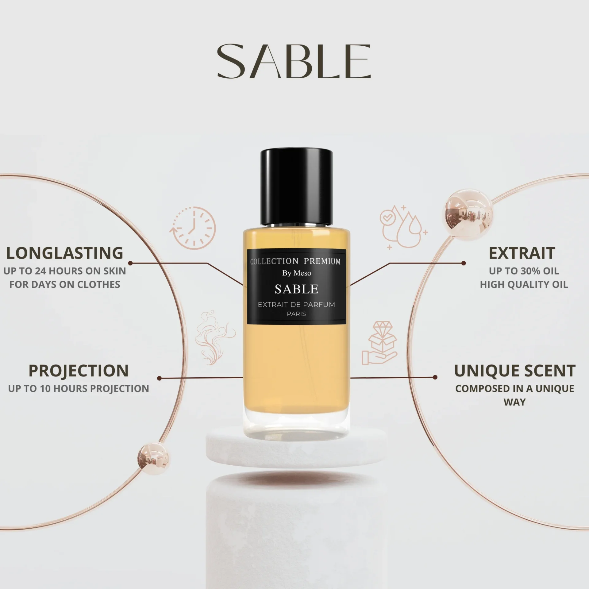 Sable roept de herinnering op aan warme zonsondergangen op exotische locaties, waar elke geurnoot een moment van weelde en genot weerspiegelt. Het is als het vieren van het goede leven, waar elke geurnoot een eerbetoon is aan de pracht van de natuur.